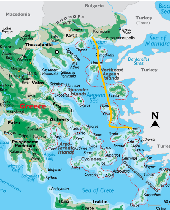 Overnights in Samothraki, Limnos, Chios, Ikaria and Samos.